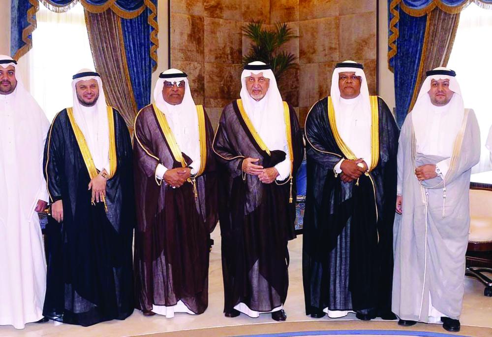 الأمير خالد الفيصل مستقبلا مدير وقياديي جامعة أم القرى أمس. (عكاظ)