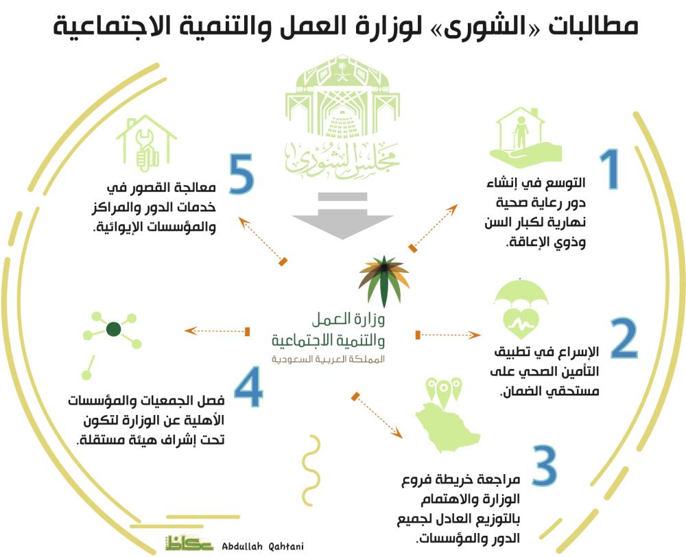 كما طالب المجلس وزارة العمل والتنمية الاجتماعية بالتوسع في إنشاء دور رعاية صحية نهارية لكبار السن وذوي الإعاقة والمرضى ما بعد العمليات، وهي توصية إضافية تقدم بها إلى المجلس عضو المجلس الدكتور خالد العقيل، وقرر المجلس مطالبة الوزارة بالإسراع في تطبيق التأمين الصحي على الفئات المستحقة للضمان الاجتماعي، ومراجعة خريطة فروعها والقيام بالتوزيع العادل لجميع الدور والمؤسسات والمراكز، بحيث تخدم جميع الفئات في جميع مناطق المملكة.