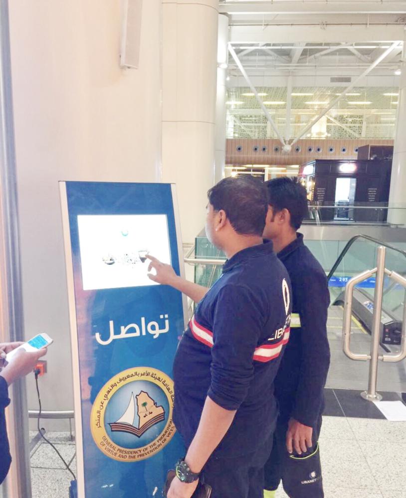 وزع فرع الرئاسة العامة لهيئة الأمر بالمعروف والنهي عن المنكر في منطقة المدينة المنورة أجهزة إلكترونية للتواصل في صالات المغادرة والقدوم بمطار الأمير محمد بن عبدالعزيز الدولي.