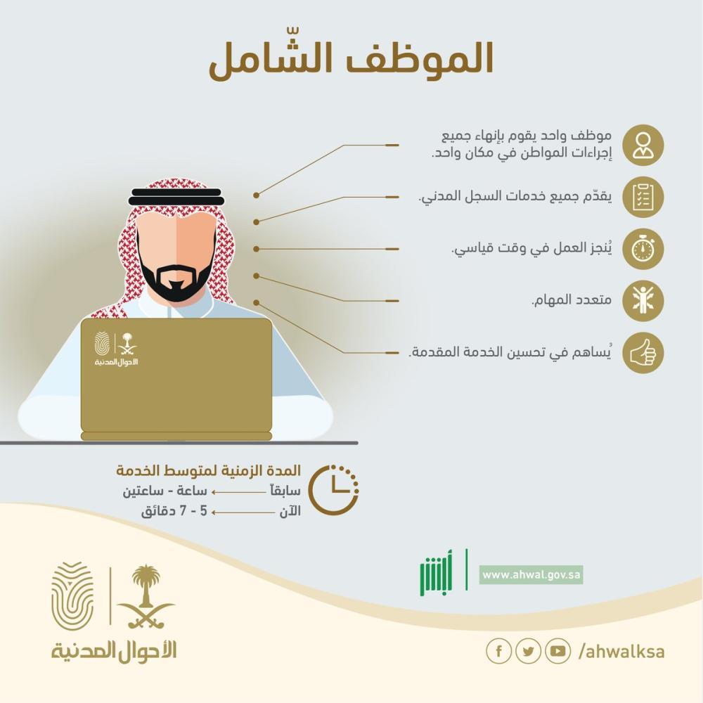وأشارت الأحوال، إلى أن "الموظف الشامل" متعدد المهام ويقوم بإنهاء جميع إجراءات المواطن في وقت قياسي وفي مكان واحد، ويقدم جميع خدمات السجل المدني ويساهم في تحسين الخدمة المقدمة.