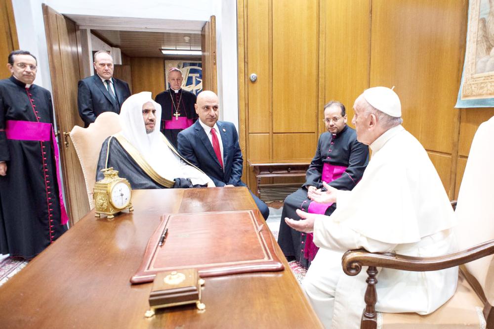 التقى الأمين العام لرابطة العالم الإسلامي الدكتور محمد بن عبدالكريم العيسى أمس (الأربعاء)، البابا فرانشيسكو بابا الفاتيكان، وتم خلال اللقاء تبادل وجهات النظر حول عدد من المواضيع ذات الاهتمام المشترك، والتي تصب في صالح السلام والوئام العالمي، خصوصاً التعاون بين الفاتيكان والعالم الإسلامي، في قضايا السلام والتعايش ونشر المحبة.