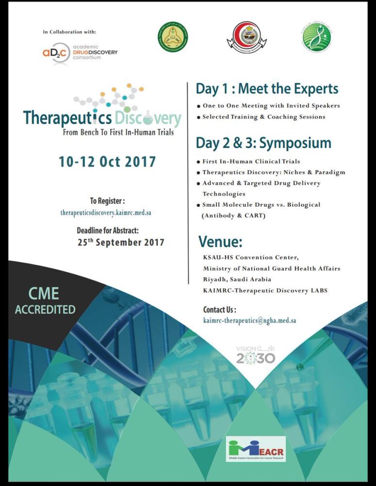 يذكر أن المؤتمر الأول للاكتشافات الدوائية يطلق من المختبر إلى التجارب السريرية، ويبلغ عدد الأوراق المقدمة ما يربو على 35 ورقة علمية محلية ودولية يطرحها خلال أيام المؤتمر متحدثين دوليين ومحليين، ويقدم للمهتمين في مجال الأدوية والبحوث العلمية والرعاية الصحية 25ساعة علمية معتمدة، يتم التسجيل فيه على الرابط التالي: http://therapeuticsdiscovery.kaimrc.med.sa.
