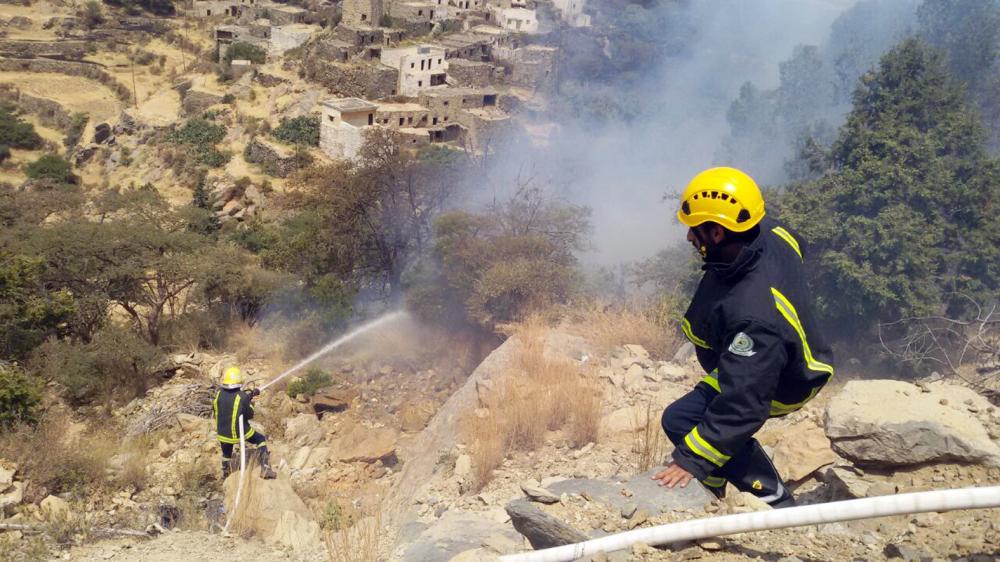 فرق الدفاع المدني بالنماص خلال إخماد حريق قرية العقيقة. (عكاظ)