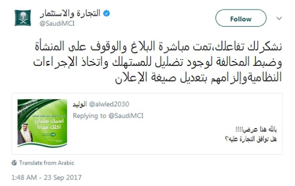 وقالت الوزارة عبر حسابها في «تويتر»: «نشكرلك تفاعلك، تمت مباشرة البلاغ والوقوف على المنشأة وضبط المخالفة لوجود تضليل للمستهلك واتخاذ الإجراءات النظامية وإلزامهم بتعديل صيغة الإعلان».
