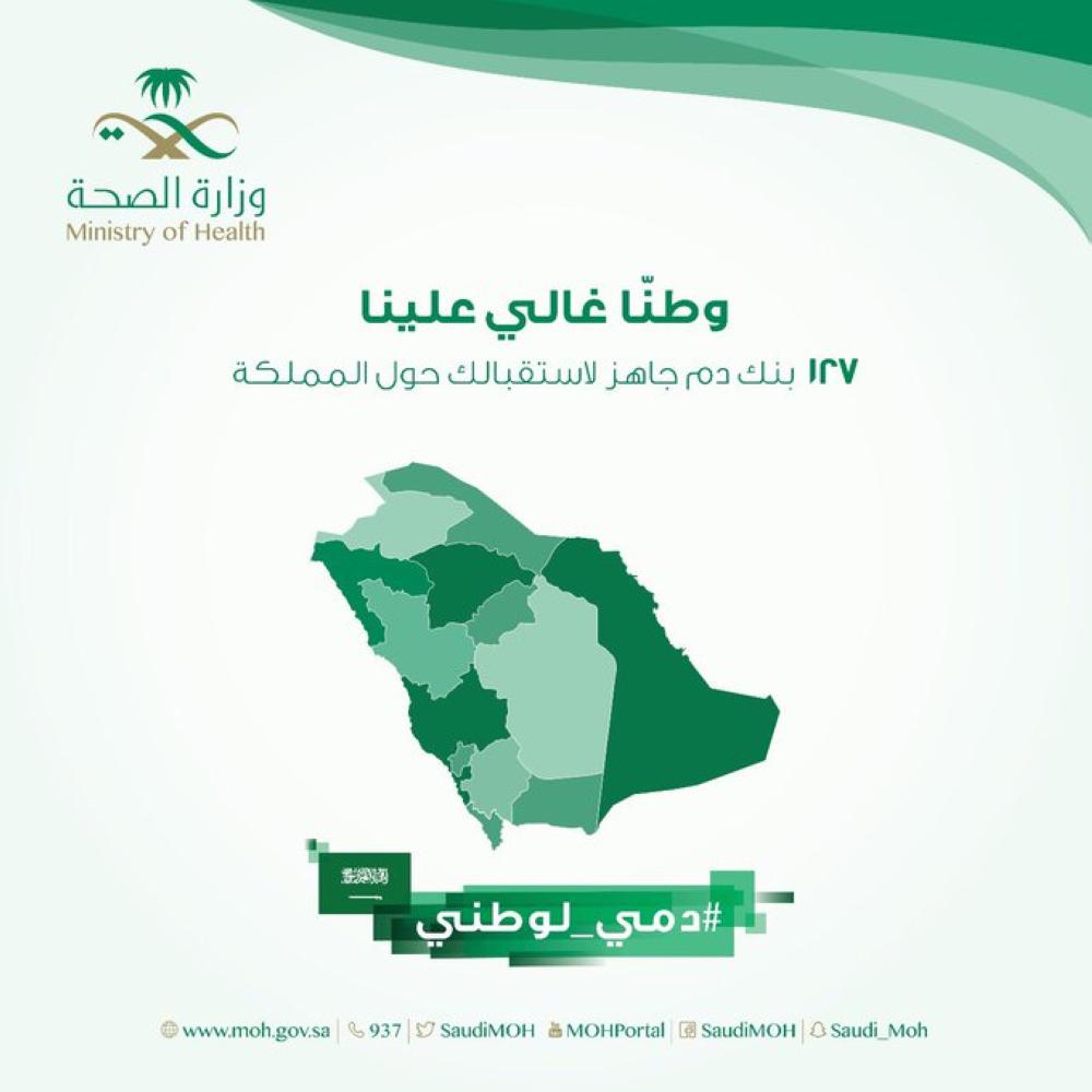 حددت وزارة الصحة 127 بنكاً لاستقبال المتبرعين بالدم في حملتها الوطنية التي أطلقتها أمس (السبت) تحت شعار «دمي لوطني»؛ وذلك تزامناً مع الاحتفالات باليوم الوطني.