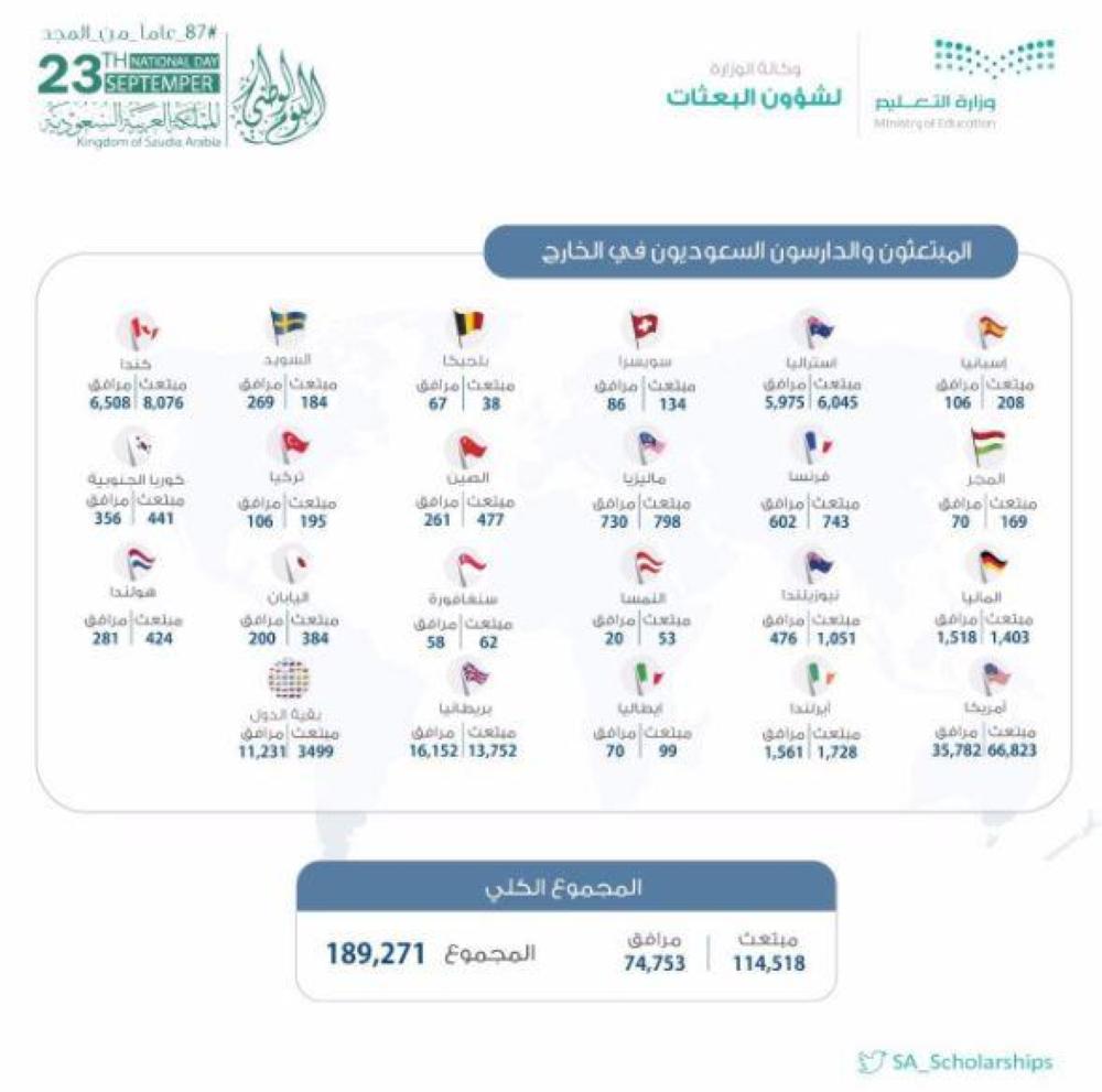 أعلنت وكالة وزارة التعليم لشؤون البعثات عن إحصائية حديثة لعدد المبتعثين السعوديين في الخارج, إذ بلغ مجموع المبتعثين حسب الأرقام التي نشرتها 114,518 طالب سعودي موزعين على جامعات العالم المختلفة، في حين بلغ عدد المرافقين 74,753 من أفراد أسرهم مسجلين لدى الوزارة كـ«مرافقي مبتعث».