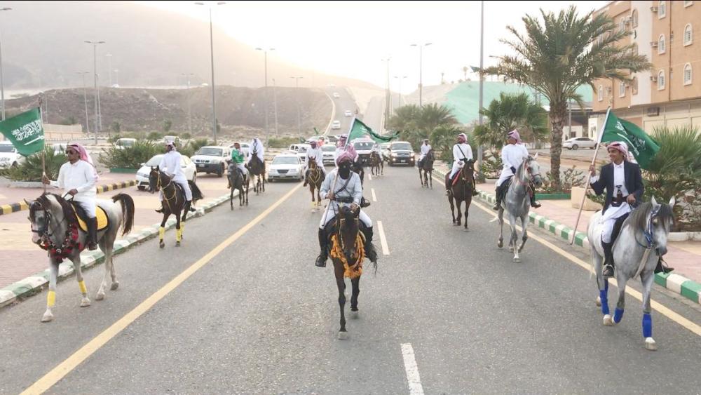 كما شارك فرسان محايل عسير في اليوم الوطني من على صهوات الجياد عابرين طريق الشهداء قبل أن يتجولوا في المحافظة مشكلين مسيرة رفعوا من خلالها الأعلام ورددوا الأهازيج الوطنية.