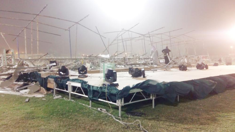 قبل دقائق من انطلاق حفل أهالي جازان بمناسبة اليوم الوطني في المدينة الرياضية مساء أمس (الأحد)، انهار المسرح المعد للاحتفال فجأة، دون أن يوقع أية إصابات. واكتفت اللجنة المنظمة للحفل بالتأكيد على أن المسرح سقط بسبب عاصفة رعدية، معلنة تأجيل الحفل. في وقت باشر الدفاع المدني موقع الانهيار وتم إخلاء الاستاد من الجماهير الحاضرة، فيما باشرت الجهات الأمنية الموقع، إذ انحسرت الخسائر في المعدات والتجهيزات الخاصة بالمسرح.
