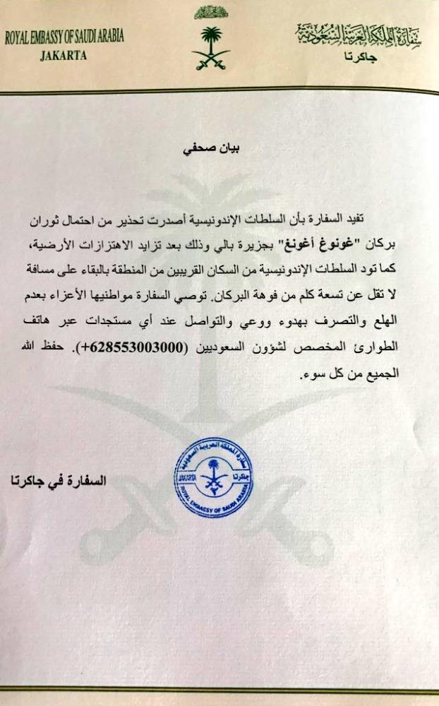 أفادت سفارة خادم الحرمين الشريفين في جمهورية إندونيسيا اليوم (الأربعاء) بأن السلطات الإندونيسية أصدرت تحذير من احتمال ثوران بركان "غونوغ اغونغ" بجزيرة بالي، وذلك بعد تزايد الاهتزازات الارضية، كما تود السلطات الإندونيسية من السكان القريبين من المنطقة بالبقاء على مسافة لاتقل عن 9 كلم من فوهة البركان.