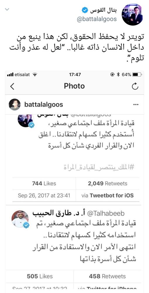 على هامش الفرحة العارمة التي اجتاحت مواقع التواصل الاجتماعي إثر إعلان السماح للمرأة بقيادة السيارة في السعودية كتب مذيع قناة العربية بتال القوس تغريدةً قال في نصها «قيادة المرأة ملف اجتماعي صغير، أُستخدم كثيرا كسهام لانتقادنا.. اغلق الآن والقرار الفردي شأن كل أسرة».