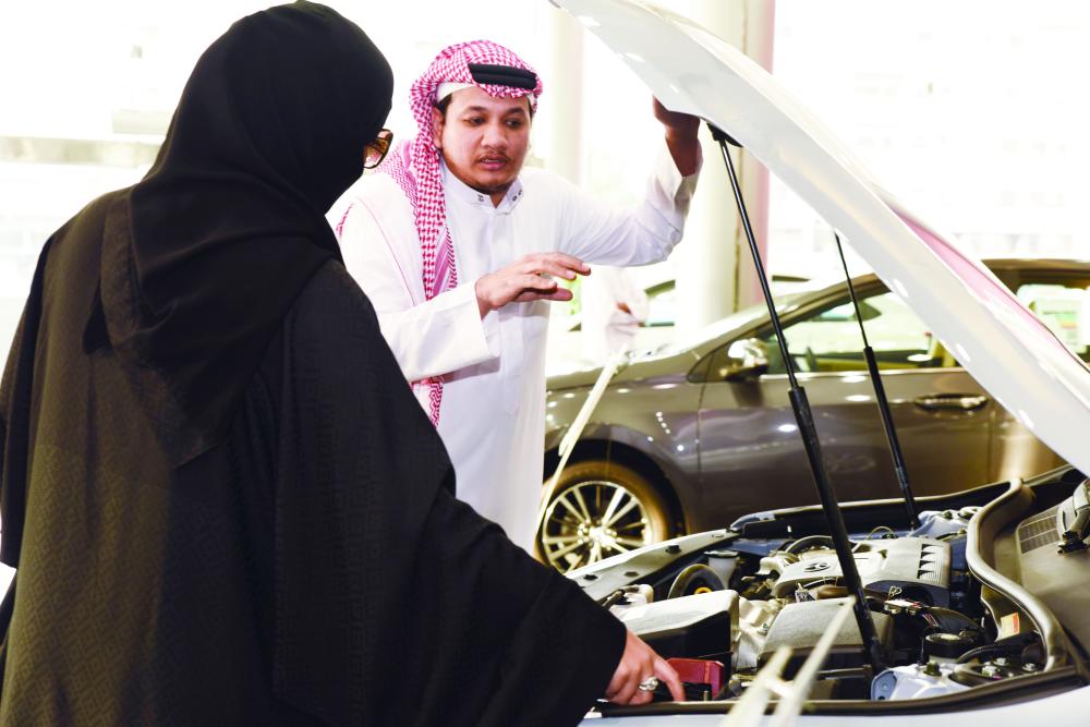 سعودية تعاين سيارة في أحد معارض السيارات بجدة أمس. (تصوير: أمل السريحي)