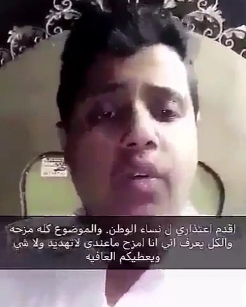 ودون الشاب على الفيديو اعتذارا بقوله: «أقدم اعتذاري لنساء الوطن، والموضوع كله مزحة، والكل يعرف أني أنا أمزح ما عندي لا تهديد ولا شي ويعطيكم العافية».