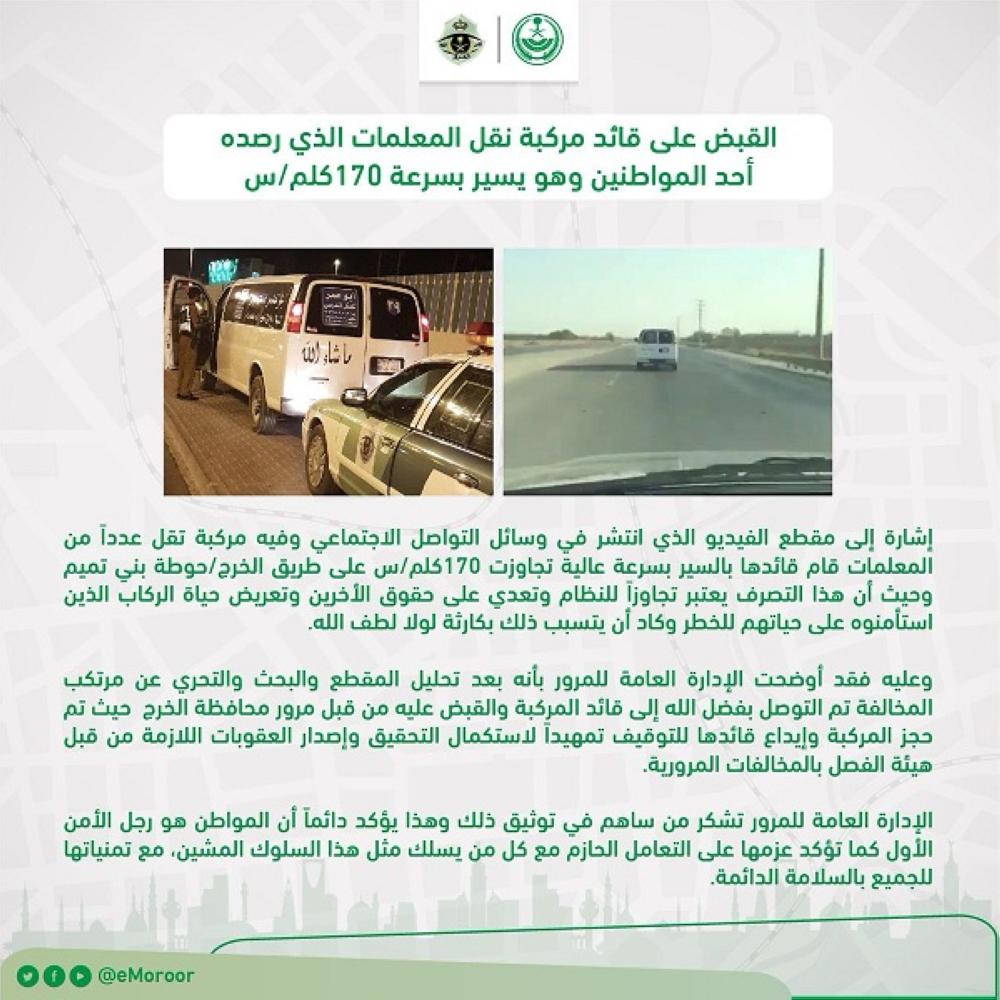 وقالت الإدارة العامة للمرور: إشارة إلى مقطع الفيديو الذي انتشر في وسائل التواصل الاجتماعي، وفيه مركبة تقل عددا من المعلمات قام قائدها بالسير بسرعة عالية تجاوزت 170 كلم/س على طريق الخرج - حوطة بني تميم، وحيث إن هذا التصرف يعتبر تجاوزا للنظام وتعديا على حقوق الآخرين وتعريض حياة الركاب الذين استأمنوه على حياتهم للخطر وكاد أن يتسبب ذلك بكارثة لولا لطف الله.