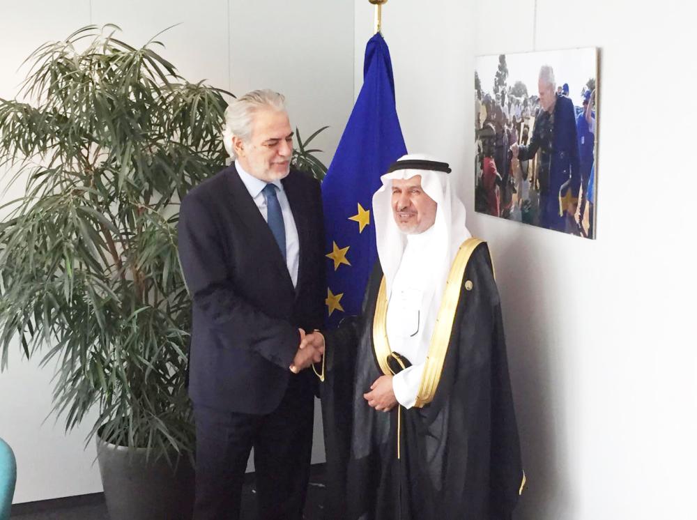 الربيعة مصافحاً المفوض الأوروبي للمساعدات الإنسانية وإدارة الأزمات .(واس)
