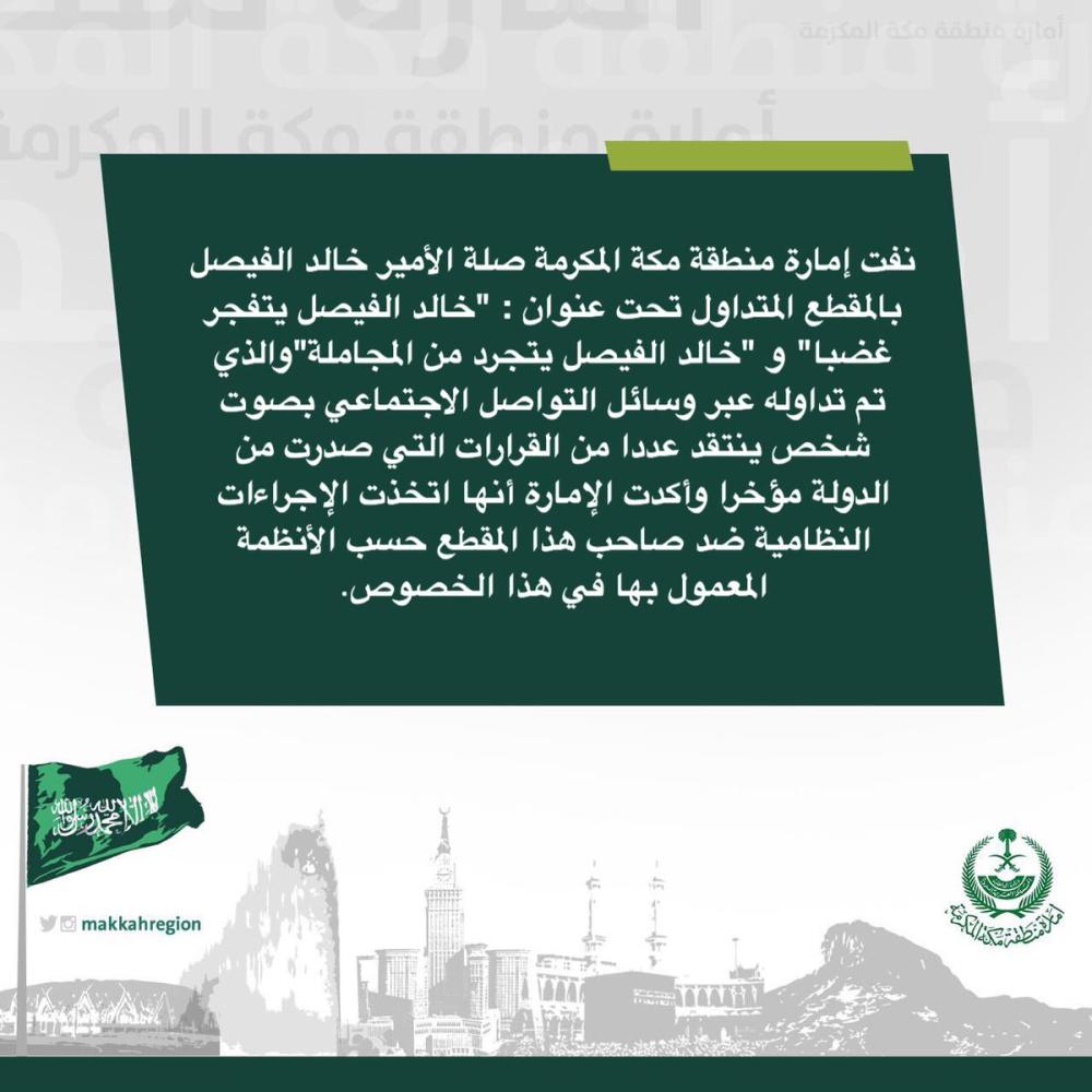 نفت إمارة منطقة مكة المكرمة، صلة الأمير خالد الفيصل بالمقطع المتداول تحت عنوان "خالد الفيصل يتفجر غضباً"، و "خالد الفيصل يتجرد من المجاملة"، والذي جرى تداوله على مواقع التواصل الاجتماعي بصوت شخص ينتقد عدداً من القرارات التي صدرت من الدولة أخيراً.
