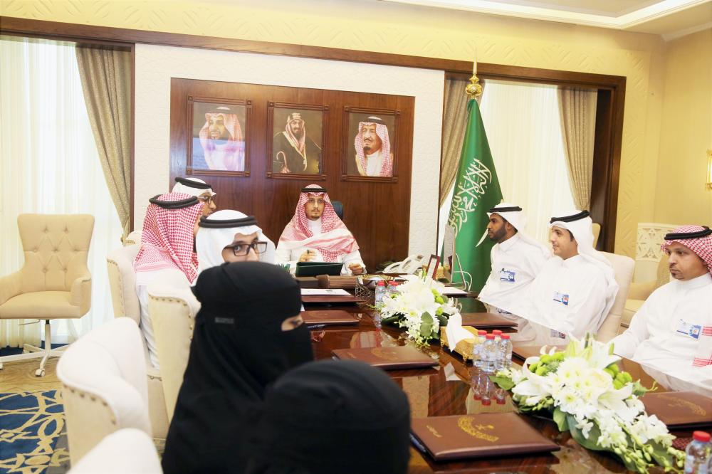 الأمير أحمد بن فهد مستقبلا منسوبي فرع جمعية الجودة. (عكاظ)