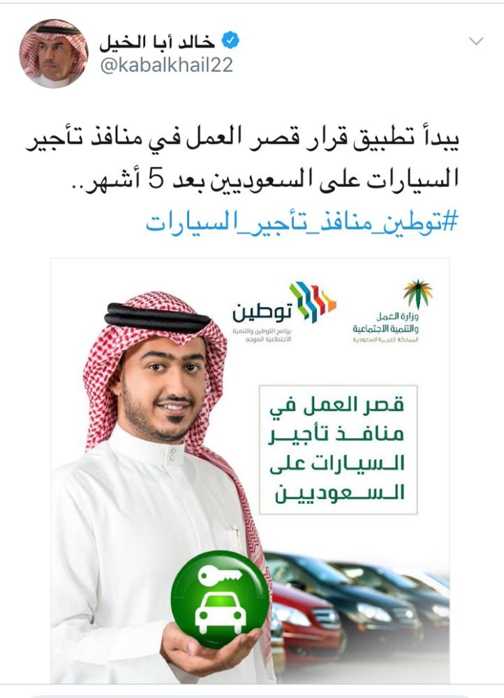 وكان وزير العمل والتنمية الاجتماعية الدكتور علي بن ناصر الغفيص أصدر موخراً بإقتصار العمل في منافذ تأجير السيارات على السعوديين فقط، اعتبارا من 1/ 7/ 1439هـ.