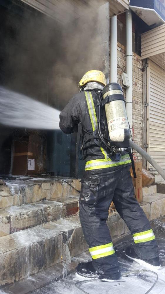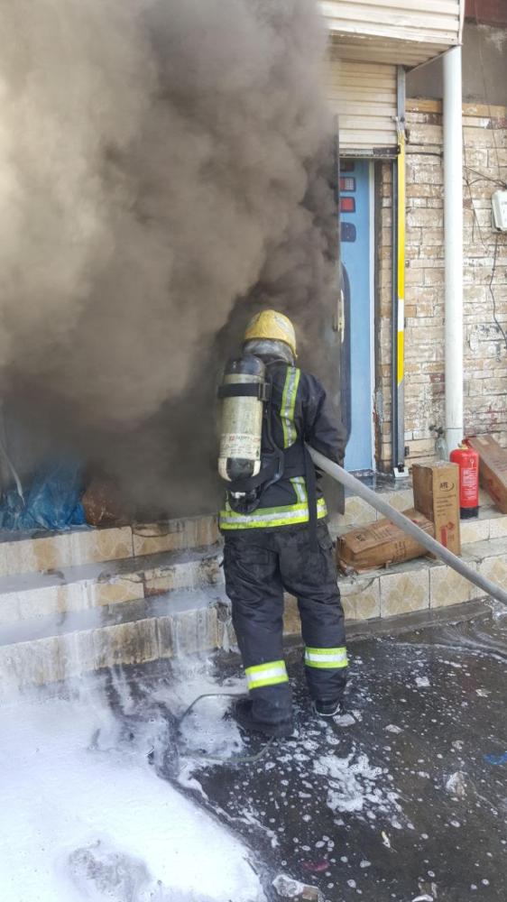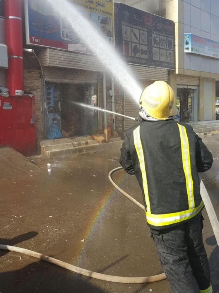 وقال: مع وصول فرق الدفاع المدني كانت سحب الدخان تغطي أرجاء منطقة الاحتراق، نتيجة المواد المشتعلة من قطع غيار وإطارات متنوعة (كفرات)، وبما أن المستودع المحترق تحيط به مستودعات لم تتأثر بالحريق وخشية أن تصل إليها ألسنة اللهب، عمدت فرق من الإطفاء إلى عمل ساتر مائي يمنع من امتداد الحريق لتلك المستودعات، وفي نفس الوقت باشرت فرق الإنقاذ في عمل ممرات لتمكن فرق الإطفاء من الوصول إلى مصادر اللهب من خلال فتح أبواب كانت مغلقة.