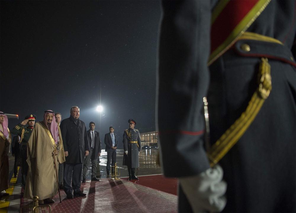 وقد أجريت لخادم الحرمين الشريفين الملك سلمان بن عبدالعزيز آل سعود مراسم استقبال رسمية ، حيث عزف السلام الملكي السعودي والسلام الوطني الروسي، ثم استعرض حرس الشرف.