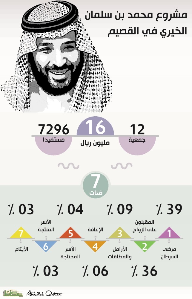 تبرع نائب خادم الحرمين الشريفين الأمير محمد بن سلمان بن عبدالعزيز من حسابه الخاص بمبلغ 16 مليون ريال للجمعيات الخيرية في منطقة القصيم، وذلك استكمالا للدعم المقدم للجمعيات الخيرية ضمن «مشروع دعم الأمير محمد بن سلمان بن عبدالعزيز للجمعيات الخيرية في جميع مناطق المملكة».