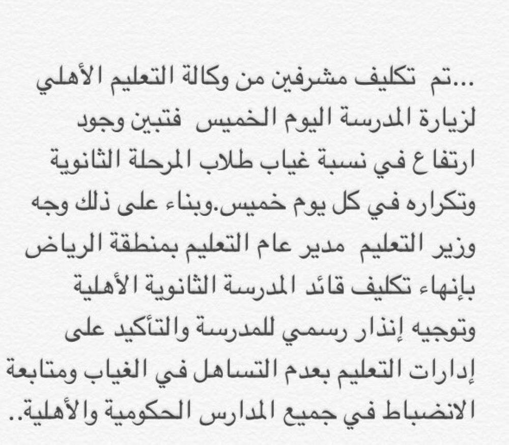 وتم تكليف مشرفين من وكالة التعليم الأهلي بزيارة المدرسة، حيث تبين ارتفاع نسبة غياب طلاب المرحلة الثانوية وتكراره كل يوم خميس، وبناء على ذلك، وجّه وزير التعليم مدير عام التعليم بمنطقة الرياض بإنهاء تكليف قائد المدرسة الثانوية الأهلية، وتوجيه إنذار رسمي للمدرسة، والتأكيد على إدارات التعليم بعدم التساهل في الغياب، ومتابعة الانضباط في جميع المدارس الحكومية والأهلية.