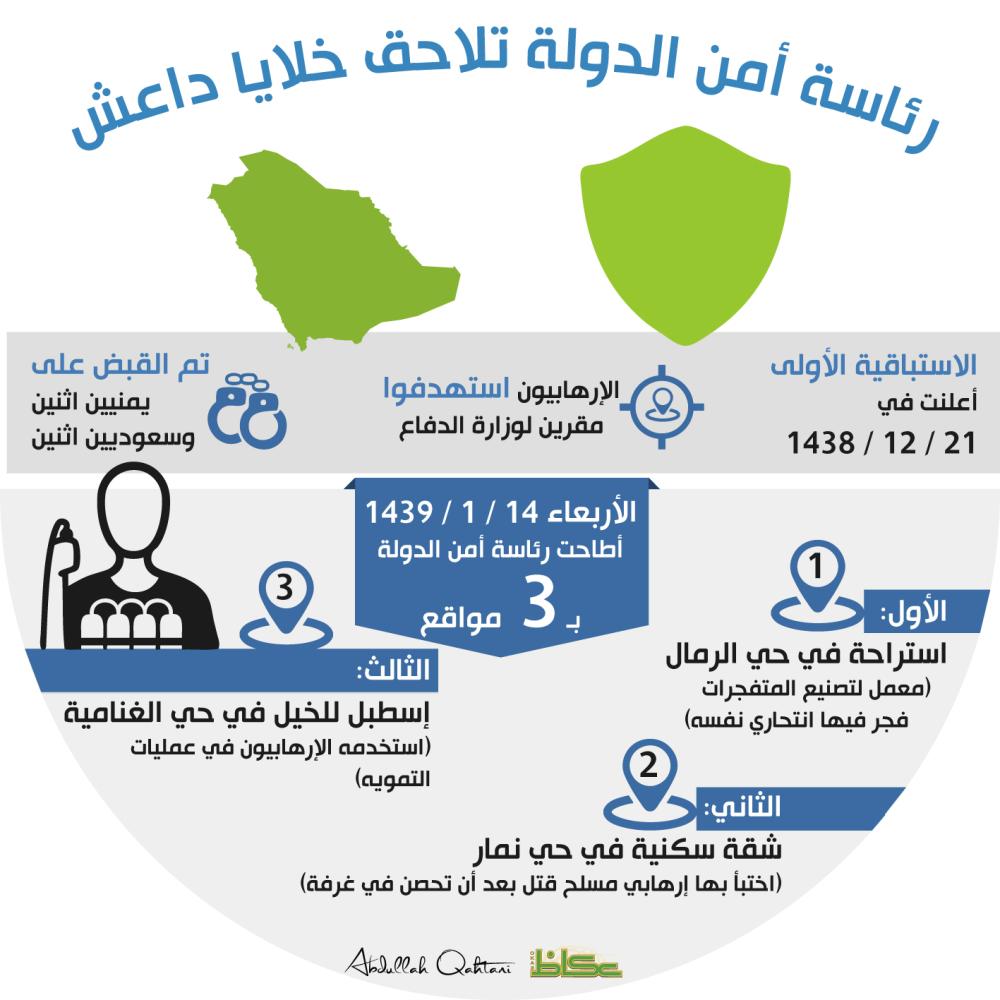 صرح مصدر مسؤول برئاسة أمن الدولة بأنه إلحاقا للبيان المعلن بتاريخ 21/12/1438هـ، بشأن إحباط مخطط إرهابي لتنظيم داعش الإرهابي كان يستهدف مقرين تابعين لوزارة الدفاع في مدينة الرياض بعملية انتحارية، والقبض على الانتحاريين المكلفين بتنفيذها من الجنسية اليمنية، وشخصين آخرين من الجنسية السعودية، فقد تمكنت الرئاسة يوم الأربعاء 14/1/1439هـ، في عملية أمنية استباقية من الإطاحة بخلية مرتبطة بتنظيم داعش الإرهابي في الخارج، لتنفيذ مخططاته التي تستهدف أمن واستقرار المملكة، ومداهمة ثلاثة مواقع تابعة لهذه الخلية، الأول منها عبارة عن استراحة تقع في حي الرمال شرقي مدينة الرياض، وتحتوي على معمل لتصنيع الأحزمة الناسفة، والعبوات المتفجرة، لاستخدامها في ارتكاب جرائمهم الإرهابية، وكان بداخلها عنصر انتحاري، أقدم بعد محاصرة الموقع وتوجيه النداءات له بالاستسلام، على تفجير نفسه بواسطة حزام ناسف، ما أدى إلى تناثر أشلائه داخل الاستراحة، واشتعال النيران فيها، وفي استراحة مجاورة لها.