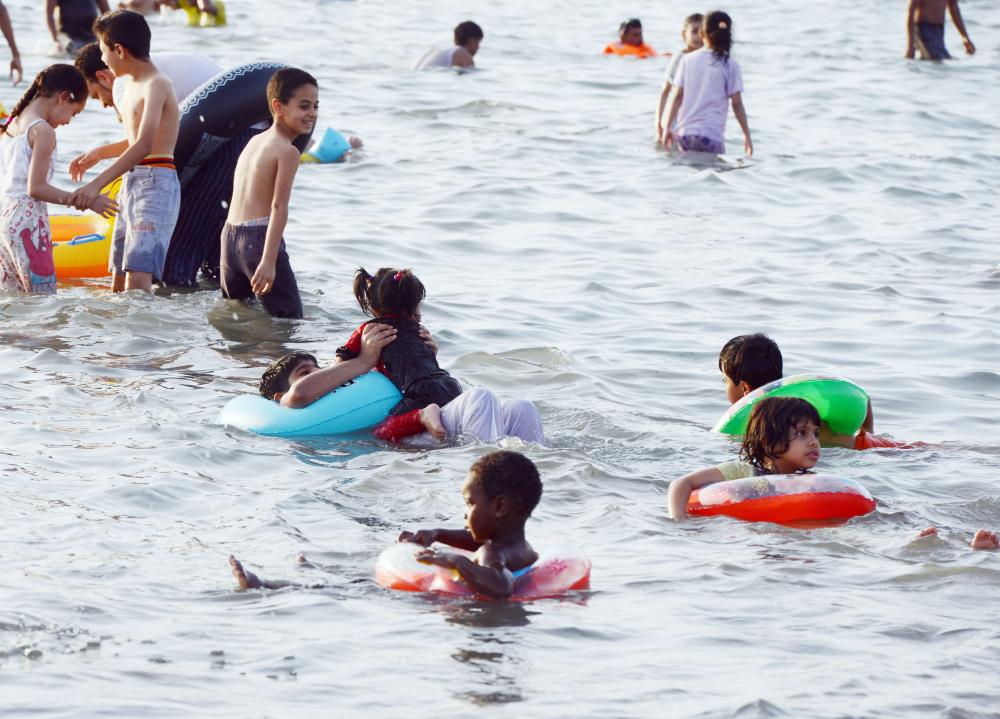 أطفال يسبحون في شاطئ الإسكندرية بجدة. (تصوير: ناصر محسن)