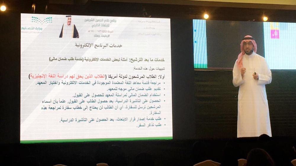 واستعرض مدير البرنامج الدكتور عبدالرحمن الحضيف إجراءات الابتعاث في المرحلة الثانية عشرة، والترشح للبرنامج، والخدمات الإلكترونية التي ستكون متاحة للطلاب والطالبات بعد حضور أيام الملتقى، تلاه محاضرة لمدير عام الإدارة العامة لشؤون الابتعاث الدكتور محمد العمر عن إجراءات ما بعد الابتعاث.