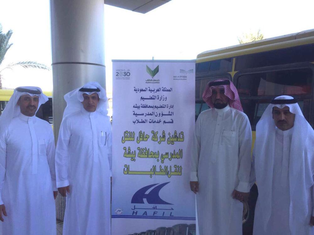 نيابة عن مدير تعليم بيشة نايف الهاجري، دشن مساعداه للشؤون التعليمية والمدرسية خالد الغامدي ومحمد آل جرية، بحضور مدير خدمات الطلاب عبدالعزيز الجديع، ومندوب شركة حافل في بيشة، وعدد من منسوبي الإدارة ووسائل الإعلام، انطلاقة شركة حافل للنقل المدرسي لنقل 20056 طالبة في مختلف مدارس بيشة.