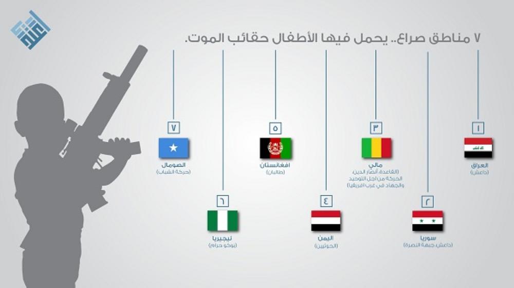 وتبدو الصورة أكثر قتامة في 7 مناطق يتم فيها استغلال الطفولة من قبل التنظيمات الإرهابية كـ«داعش» في العراق، و«الحوثيين» في اليمن، و«طالبان» في أفغانستان، و«داعش، جبهة النصرة» في سورية، و«القاعدة، أنصار الدين، الحركة من أجل التوحيد والجهاد في غرب أفريقيا» في مالي، و«بوكو حرام» في نيجيريا، و«حركة الشباب» في الصومال.