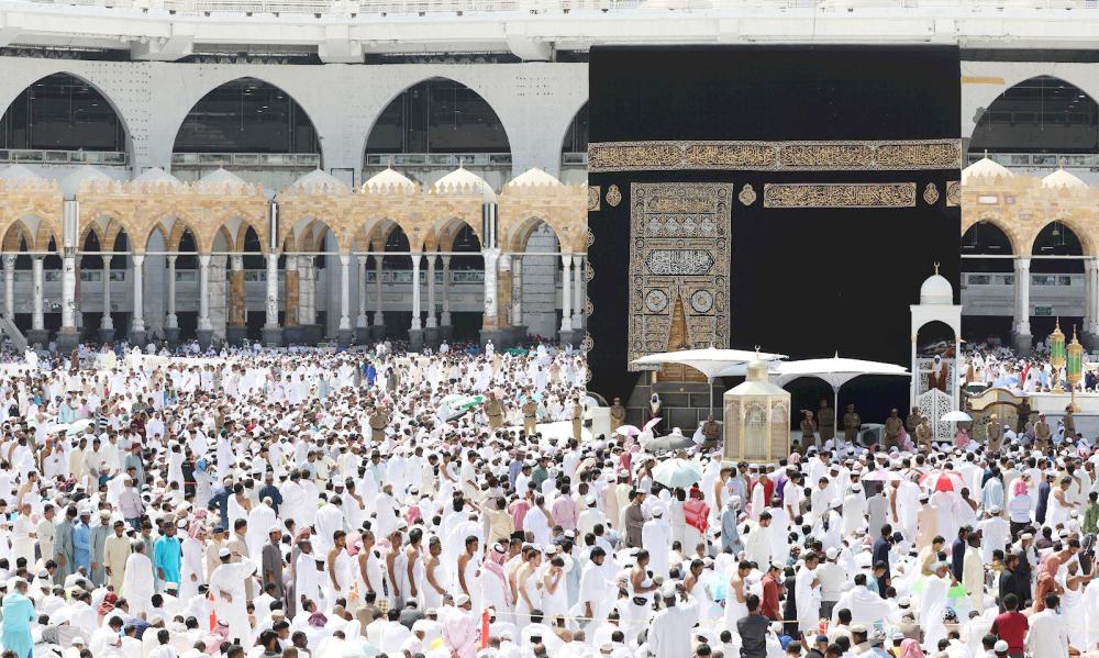 المصلون يؤدون صلاة الجمعة في المسجد الحرام أمس. (واس)