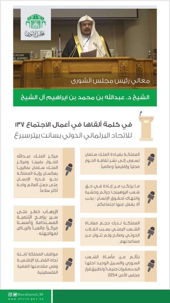 جاء ذلك في كلمة ألقاها أمس (الأحد) ضمن أعمال الاجتماع السابع والثلاثين بعد المئة للاتحاد البرلماني الدولي في سانت بطرسبرغ بروسيا الاتحادية، الذي يعقد تحت عنوان "تعزيز التعددية الثقافية والسلام من خلال الحوار بين الأديان والأعراق".