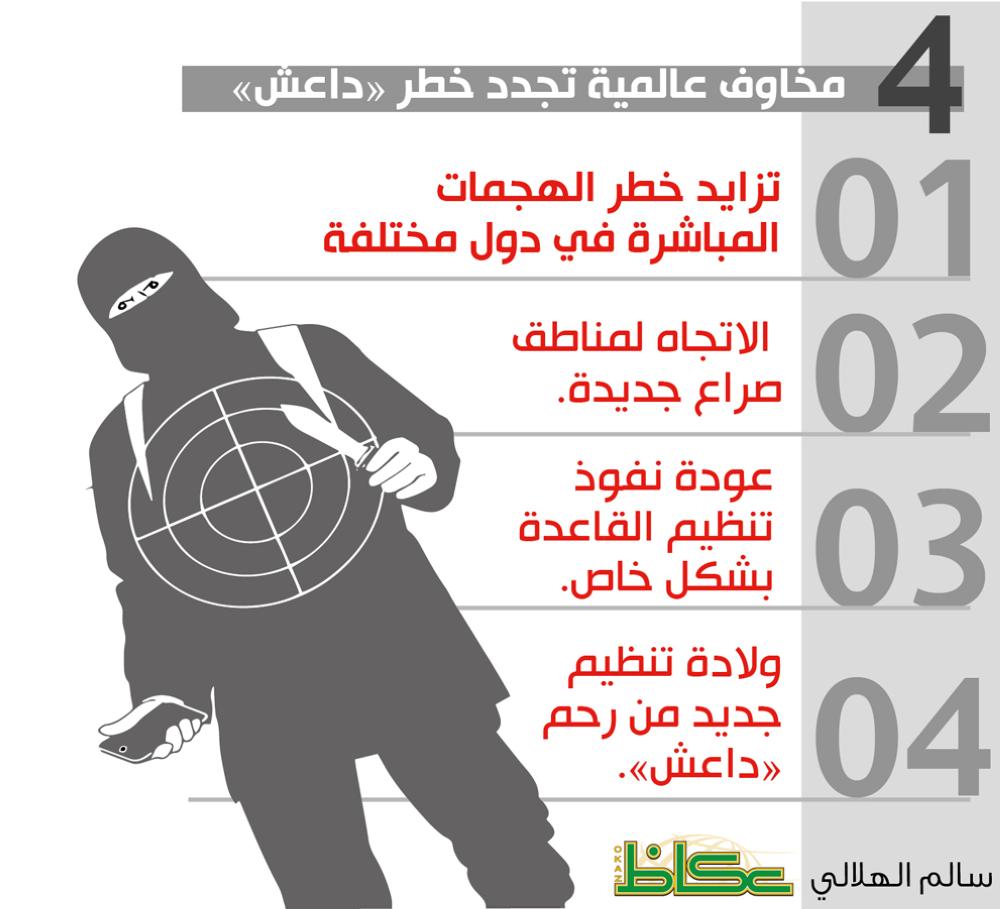 وبحسب مراقبين فإن هذا الانهيار واقتراب نهاية «داعش» بشكله الحالي يقود إلى 4 مخاوف عالمية وهي: تزايد خطر الهجمات المباشرة في دول مختلفة، الاتجاه لمناطق صراع جديدة، عودة نفوذ تنظيم القاعدة بشكل خاص، وولادة تنظيم جديد من رحم «داعش».