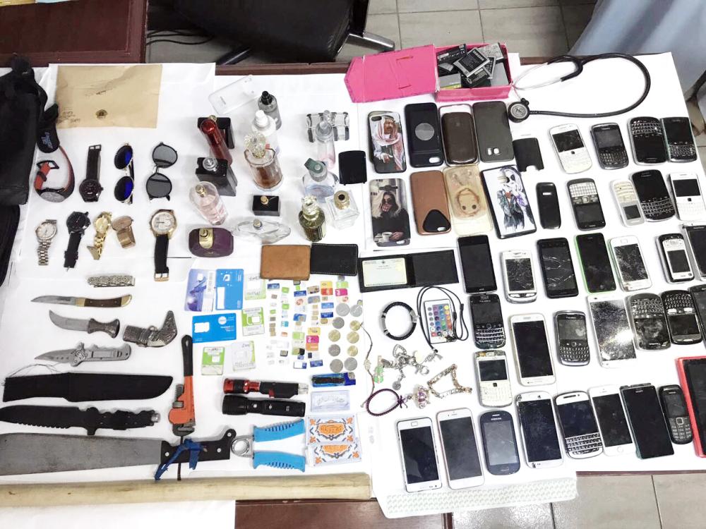 مسروقات وأسلحة بيضاء وهواتف محمولة ومعدات مختلفة عثرت عليها بحوزة أفراد العصابة. (عكاظ)