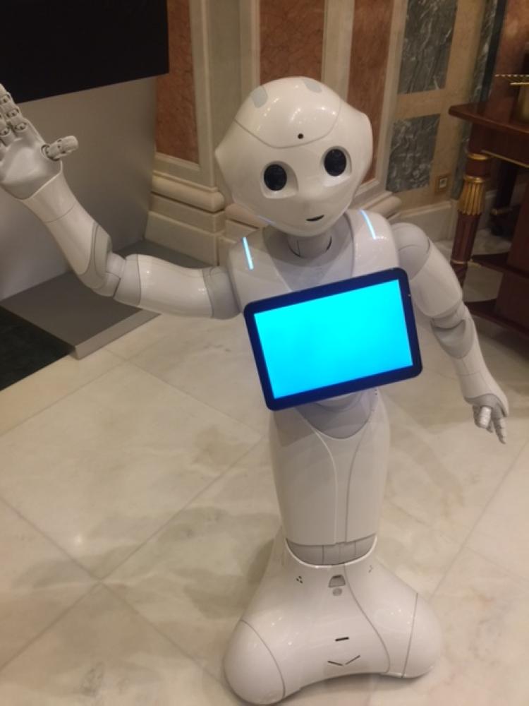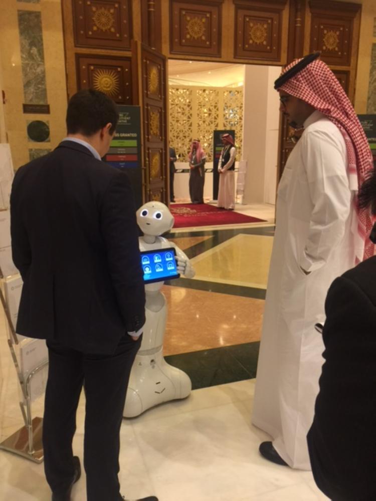 توقف المشاركين في «مبادرة مستقبل الاستثمار»أمام الروبوت «بيبر» كنموذج للعالم الجديد، وهو يقف بجوار بوابات المبادرة مستقبلا الحضور، ويعرفهم بفعاليات وأهمية المبادرة، ويجيب على أسئلة المشاركين والضيوف فيما يتعلق بدوره في ريادة الأعمال والاستثمار.