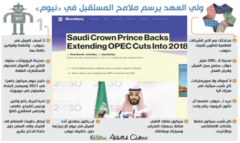 كشف ولي العهد نائب رئيس مجلس الوزراء وزير الدفاع الأمير محمد بن سلمان بن عبدالعزيز أن السعودية تجري محادثات مع بعض أكبر الشركات في العالم لتطوير تقنيات من شأنها أن تعزز سبل العيش في مدينة نيوم التي يعتزم بناءها على البحر الأحمر، بتكلفة تبلغ 500 مليار دولار.