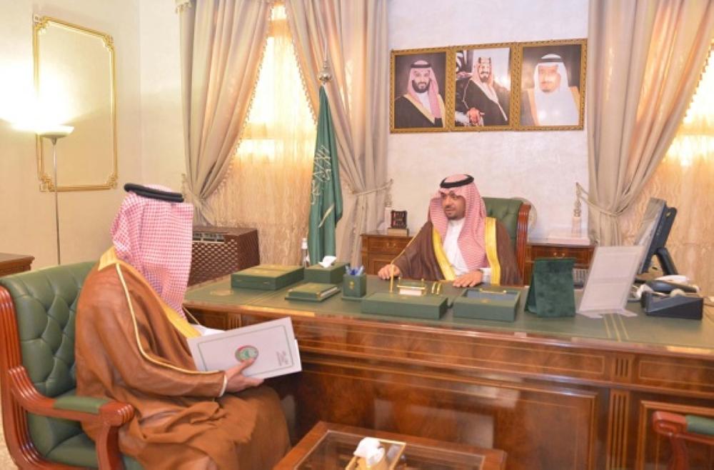 الأمير فيصل بن خالد قبل تسلمه تقرير مستشفى قوى الأمن من الحويطي. (عكاظ)