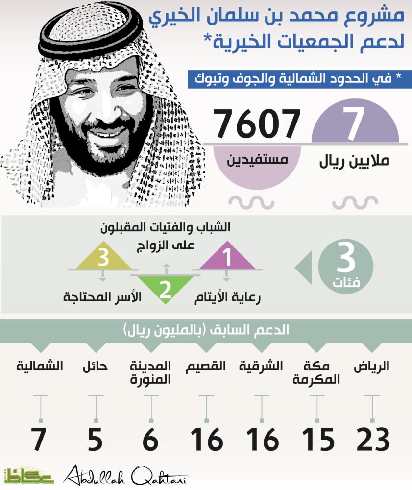 من جهة ثانية، منح ولي العهد نائب رئيس مجلس الوزراء وزير الدفاع مبلغ (7) ملايين ريال من حسابه الخاص، للجمعيات الخيرية في المنطقة الشمالية (الحدود الشمالية والجوف وتبوك)، وذلك استكمالا للدعم المقدم للجمعيات الخيرية ضمن مشروع «دعم صاحب السمو الملكي الأمير محمد بن سلمان بن عبدالعزيز للجمعيات الخيرية في جميع مناطق المملكة».