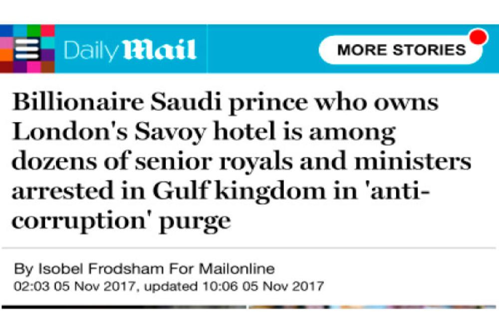 وقالت الصحيفة إن الأمير محمد بن سلمان يمثل أملاً للشعب السعودي الذي تبلغ نسبة كبيرة من أعمار سكانه أقل من 25 عاما في وقت يقود فيه السعودية في مجالي الدفاع والاقتصاد. وتناولت صحيفة الديلي ميل البريطانية نقلا عن مصادر رسمية سعودية أخبارا عن القبض على عدد من الأمراء ووزراء سابقين والتحفظ عليهم في العاصمة الرياض، وأشارت الصحيفة إلى أن المدير الخاص لمكتب ولي العهد بدر العساكر أكد عملية الاعتقال على تويتر واصفاً هذه اللحظة بالتاريخية والليلة الأكثر سواداً على الفاسدين.