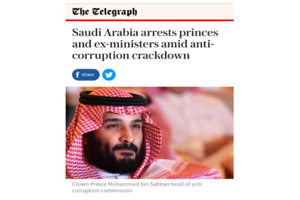 ولفتت التليغراف البريطانية إلى أن السعودية قبضت على عدد من الأمراء والوزراء السابقين ضمن حملة لمكافحة الفساد، وأن هذه الخطوات تأتي في ظل إنشاء هيئة عليا لمكافحة الفساد والتي تم تشكيلها بأمر ملكي، ناقلة عن عدد من القنوات والمغردين القبض على عدد من الأشخاص.