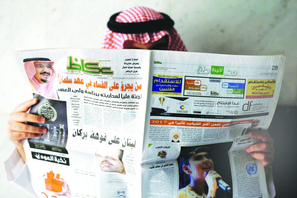 صورة بثتها «رويترز» أمس لمواطن يطلع على تغطية صحيفة «عكاظ» للأمر الملكي بتشكيل لجنة لمكافحة الفساد.
