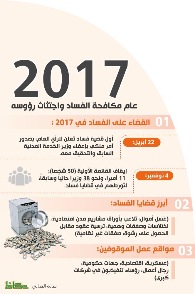 وعزز ولي العهد نائب رئيس مجلس الوزراء وزير الدفاع الأمير محمد بن سلمان في لقاء تلفزيوني على سعيه لمكافحة الفساد في البلاد، بتوعده بأنه لن ينجو أي شخص تورط في قضية فساد مهما كان منصبه؛ وزيراً كان أو أميراً، ومن تتوفر عليه الأدلة الكافية سيحاسب. ولعل عام 2017 سيكون موعدا للقضاء على الفساد والمتورطين فيه، ولن يستثنى أحد من المستنفعين من المناصب الحكومية أو رجال الأعمال، وبلغ عدد الموقوفين حتى الآن في قضايا الفساد نحو 50 رجلا ما بين أمراء ووزراء ورجال أعمال.
