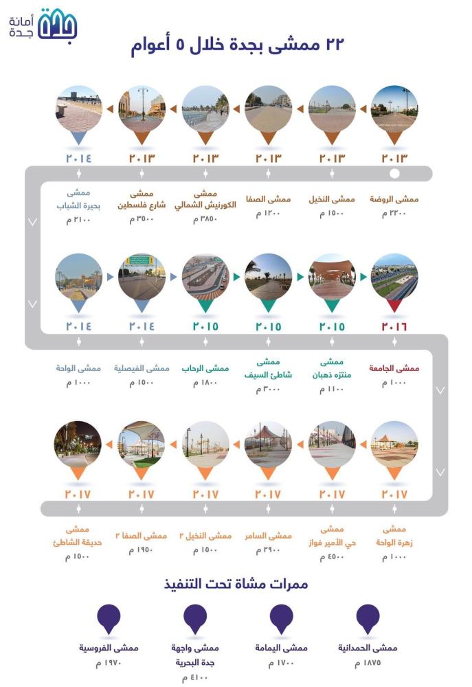 أعلنت أمانة محافظة جدة عن تنفيذها (18) ممشى في محافظة جدة، تتخطى أطوالها 50 ألف متر، وموزعة على نطاق 14 بلدية فرعية، وتم تجهيزها وفق أحدث المشاريع الرياضية وزودت بالخدمات اللازمة والتي كان آخرها ممشى حديقة الشاطئ بطول 1500م.