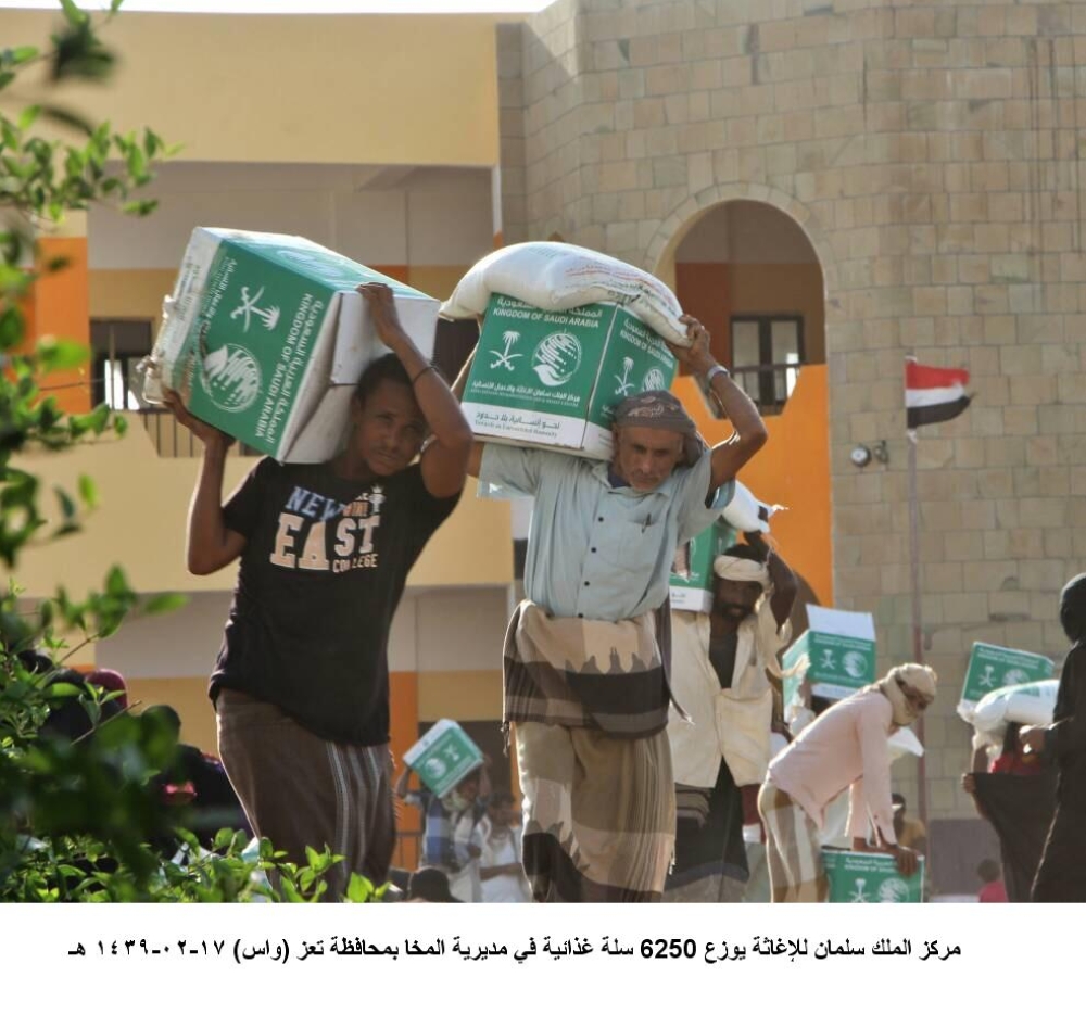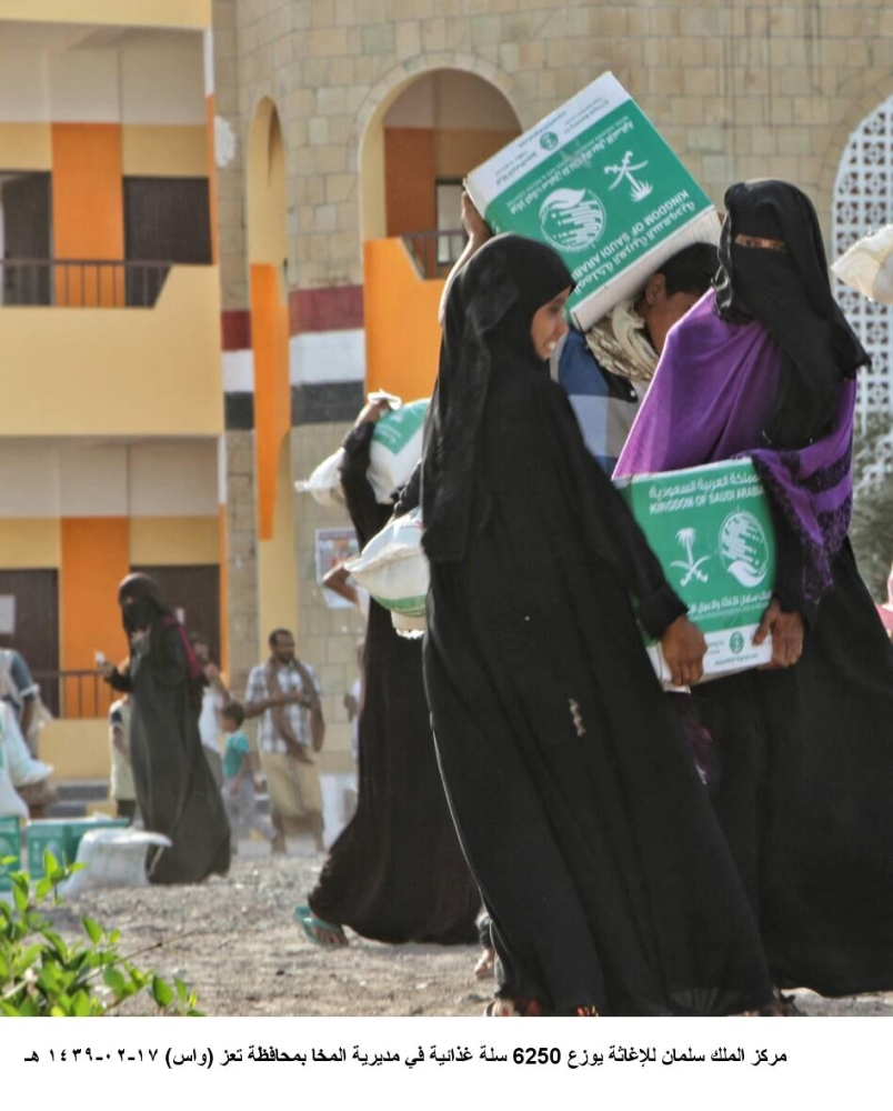 من جهة ثانية، وزع مركز الملك سلمان للإغاثة والأعمال الإنسانية أمس الأول 6250 سلة غذائية في مديرية المخا بمحافظة تعز جنوب اليمن.