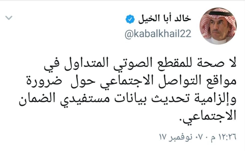 وقال أبا الخيل: «لا صحة للمقطع الصوتي المتداول في وسائل التواصل الاجتماعي حول ضرورة وإلزامية تحديث بيانات مستفيدي الضمان الاجتماعي».