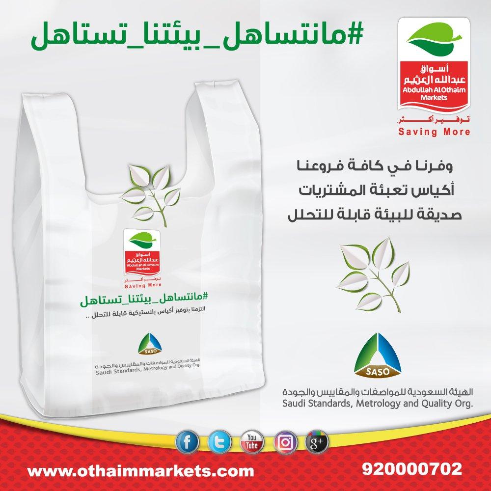 وفرت شركة أسواق عبدالله العثيم المنتجات البلاستيكية القابلة للتحلل الصديقة للبيئة في كافة فروعها المنتشرة بالمملكة وذلك ضمن إطار مشاركتها في حملة «ما نتساهل بيئتنا تستاهل» بالتعاون مع الهيئة السعودية للمواصفات والمقاييس والجودة، حيث قامت الشركة بتوفير أكياس تعبئة المشتريات قابلة للتحلل، بديلًا عن الأكياس البلاستيكية غير القابلة للتدوير.