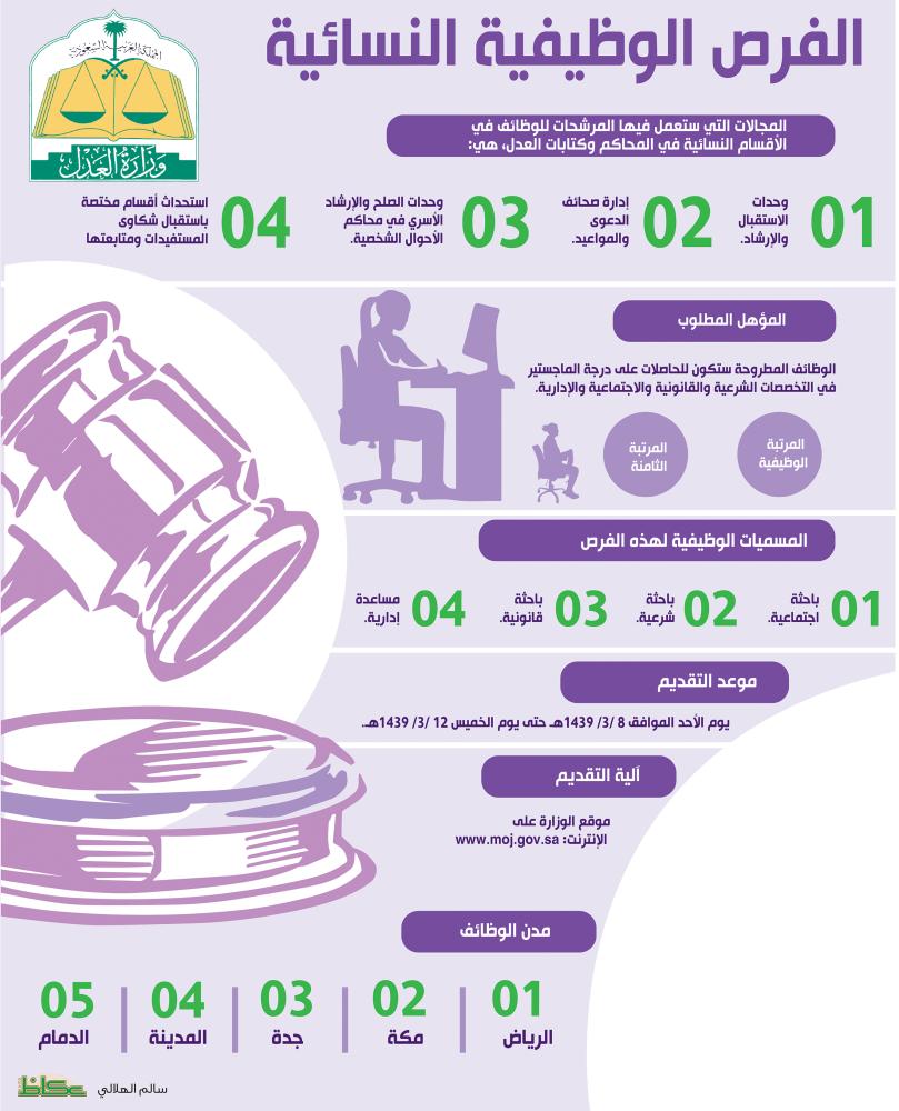 وجَّه وزير العدل الدكتور وليد الصمعاني، بفتح مجال التوظيف أمام السعوديات في الوزارة للعمل في أربعة مجالات اعتبارا من الأحد 8 ربيع الأول 1439هـ.