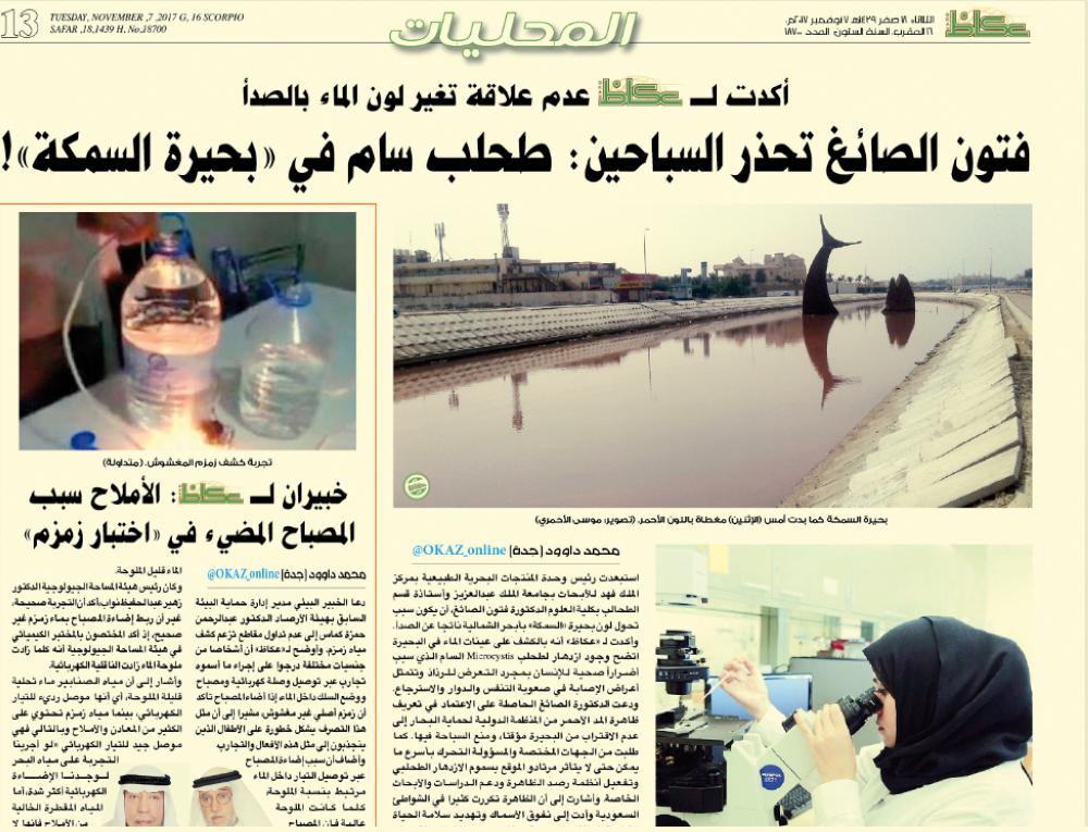 بعد أيام من نتائج بحثية أكدت وجود طحالب سامة خطرة على الإنسان في بحيرة السمكة بأبحر الشمالية في جدة، والتحذير من الاقتراب منها، قررت الهيئة العامة للأرصاد وحماية البيئة إيقاف أعمال الردم للبحيرة التي تنفذها أمانة جدة، حتى تتم معالجة مياه البحيرة والتخلص منها بالشكل الصحيح. وكانت الأمانة بدأت مشروع تأهيل الموقع ومجسم السمكة مع الحفاظ على هويته وشكله الفني باعتباره أحد معالم جدة، إلا أن تحول لون البحيرة إلى اللون الأحمر أو ما يعرف علمياً بظاهرة «المد الأحمر» الناتج من طحالب قد تكون سامة دفع مختصين لتحليل المياه؛ إذ أكدت الأسبوع الماضي رئيسة وحدة المنتجات البحرية الطبيعية بمركز الملك فهد للأبحاث بجامعة الملك عبدالعزيز أستاذة قسم الطحالب بكلية العلوم الدكتورة فتون الصائغ لـ«عكاظ» أن الطحالب سامة وفق الفحوصات المخبرية، لافتة إلى وجود طحلب Microcystis السام الذي يسبب أضرارا صحية للإنسان بمجرد التعرض للرذاذ، وتتمثل أعراض الإصابة في صعوبة التنفس والدوار والاسترجاع، وطالبت بعدم الاقتراب من البحيرة مؤقتا، ومنع السباحة فيها. كما طلبت من الجهات المختصة التحرك بأسرع ما يمكن حتى لا يتأثر مرتادو الموقع بسموم الازدهار الطحلبي، وتفعيل أنظمة رصد الظاهرة ودعم الدراسات والأبحاث الخاصة.