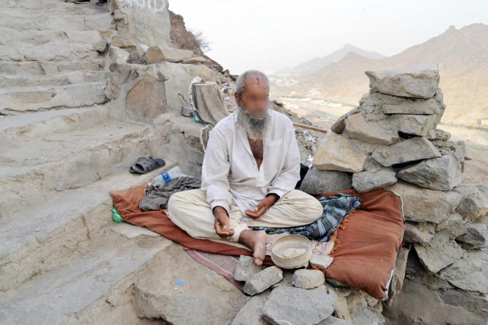 ينتشر المتسولون على طول الطريق ما بين أسفل الجبل وأعلاه، ولكل منهم طريقته الخاصة، فهناك من يتستر بالحجاب كاملا دون ظهور أي ملامح من وجهها وشكلها، وآخرون يستغلون فقدهم أعضاءهم في التسول وطلب المساعدة، والبعض يتظاهر بعدم القدرة على النهوض والاكتفاء بالتمدد على ظهره ورفع يده للزوار، حتى أن الكثير منهم يجلس في قارعة الطريق ويضايق المارة الذين يتحولون عنه يمنة ويسرة، إضافة إلى من يدفع بأطفاله الصغار من أجل التسول وكسب المال، دون الإحساس منهم بأن مثل هذه التصرفات تسيء للمكان وقداسته.