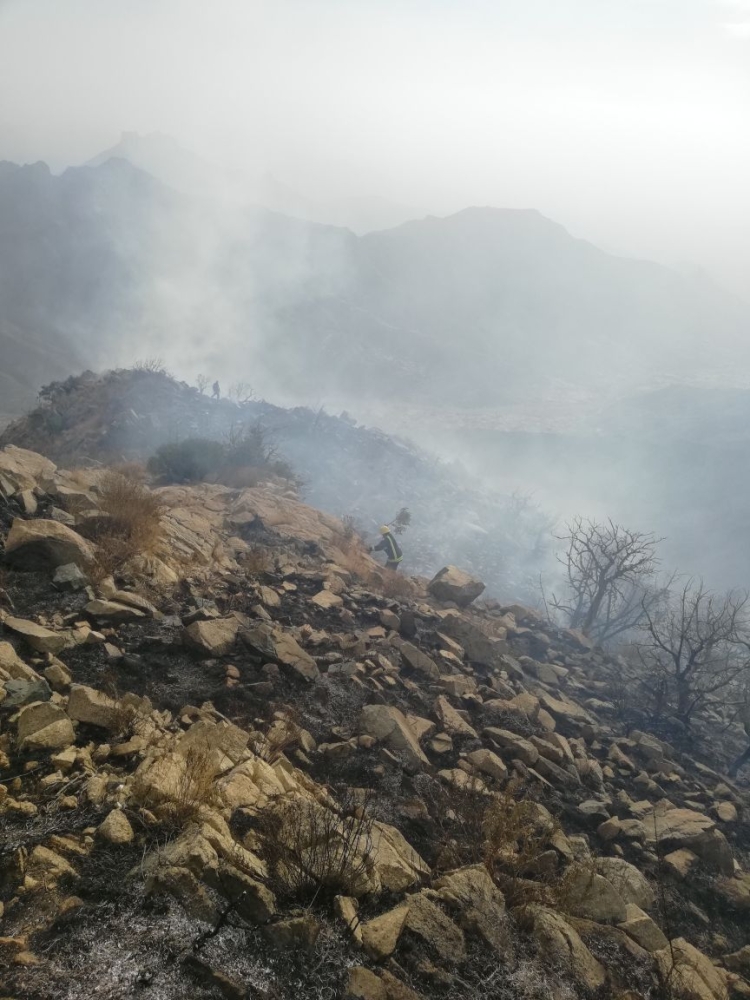 وبحسب المتحدث باسم الدفاع المدني بمنطقة عسير العقيد محمد عبدالرحيم العاصمي، فإن مساحة الجزء الذي طالتها النيران نحو 800×300 م٢ تقريباً (240 ألف م٢)، تمكنت فرق الإطفاء من احتوائه وإخماده بواسطة المعدات والوسائل اليدوية لتعذر وصول الآليات للموقع لوعورته الصخرية وطبيعته الجبلية، وأرجع سبب الحريق إلى عبث مجهولين بالموقع فيما لم يصاحبه أي إصابات.